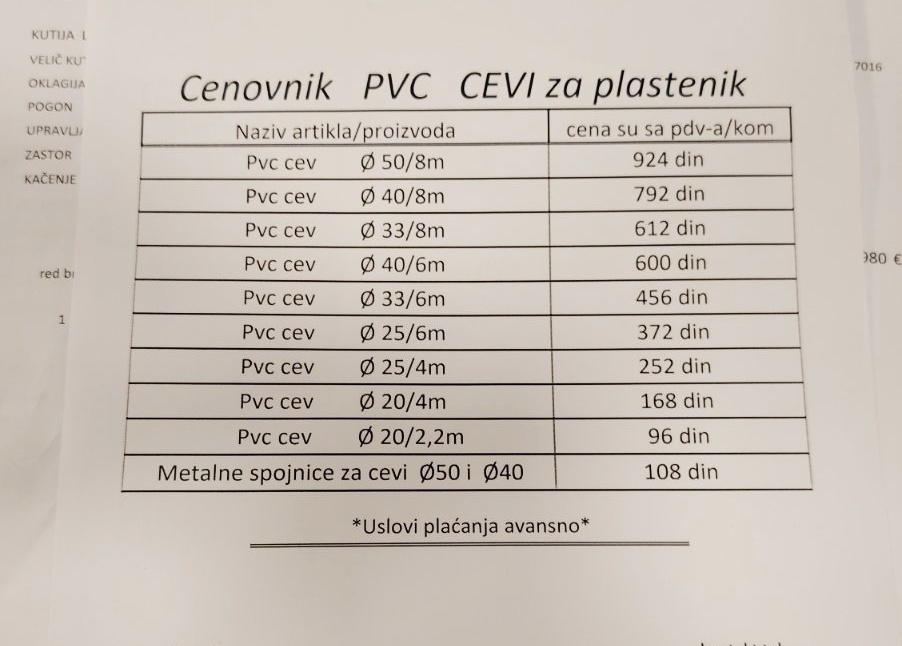 Na prodaju visokokvalitetne PVC cevi specijalno namenjene za izradu konstrukcija plastenika. Cevi su od PVC materijala što garantuje dug vek trajanja na suncu bez pucanja i gubljenja elastičnosti, glatka površina koja ne oštećuje foliju.